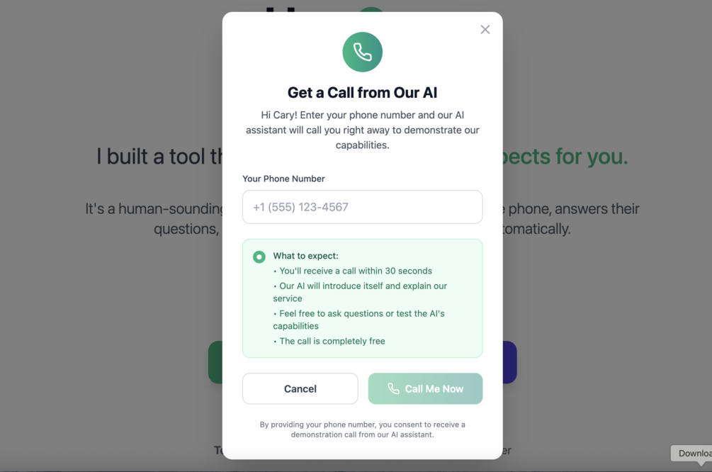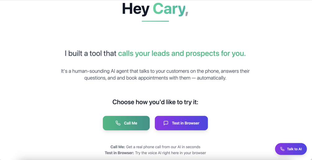 Send up to 2,000 personalized cold emails per day, each with a custom website and an AI voice agent trained on the prospect’s company.
