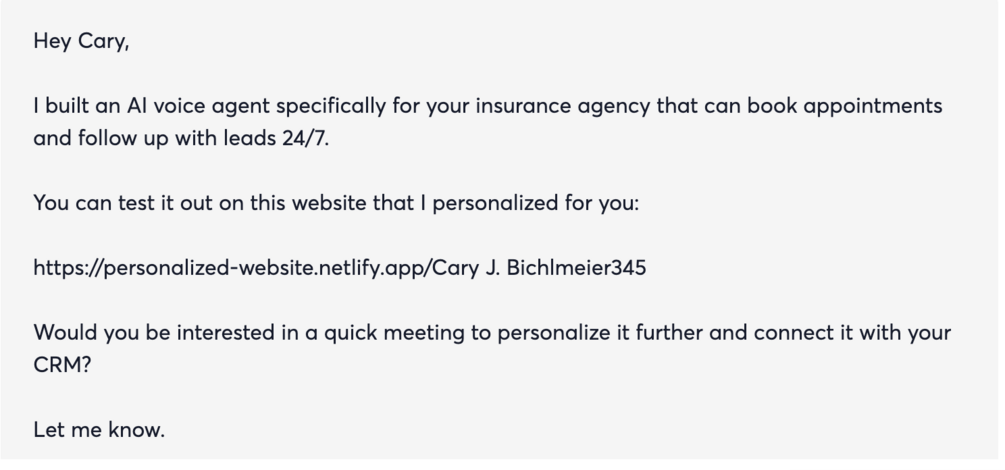 Each prospect will get a personalized email containing a link to a fully built and personalized website that has an AI agent inside it, also personalized on the prospect's company.